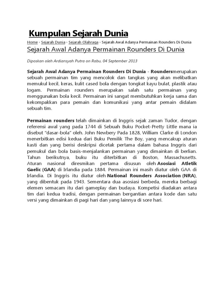 Penyusunan aturan nasiobal permainan ini secara resmi pertama kali dilakukan pada. Cepat dijawab dan dijawab semua insya allah aku kasih tercerdas. Setiap base yang dilewati pemain mendapat angka 1. Satu inning, yaitu satu kali menjadi regu title : Permainan ini masih diatur oleh gaa di irlandia. Cara menentukan nilai atau angka, yaitu: Sejarah permainan rounders permainan rounders diciptakan oleh george hanchock pada tahun 1887 di chicago, amerika serikat. Setiap base yang dilewati pemain mendapat angka 1. Satu inning, yaitu satu kali. Permainan rounders ini biasanya ditentukan oleh inning. Satu inning, yaitu satu kali menjadi regu pemukul dan satu kali menjadi regu penjaga. Lama permainan rounders ditentukan oleh inning (waktu). Setiap base yang dilewati pemain mendapat angka 1.