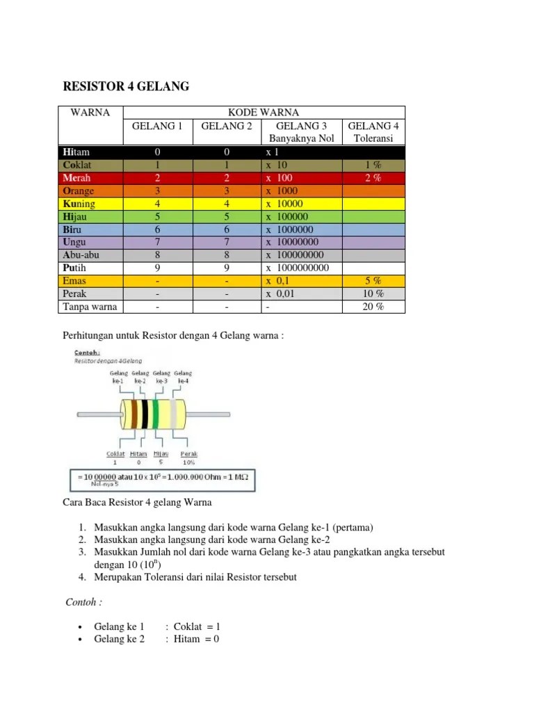 Maka nilai resistor tersebut adalah 105 * 105 = 10.500.000 ohm atau 10,5 mohm dengan toleransi 10%. Perhitungan untuk resistor dengan 5 gelang warna : Cara menghitung kode warna resistor sangat mudah dan cepat asalkan kita sudah . Jika anda berkecimpung di bidang ini, pengetahuan mengenai cara membaca resistor sangat berperan penting. Perbedaan cara penulisan nilai resistansi dengan kode warna dalam resistor tersebut memiliki cara pembacaan yang berbeda pula.
